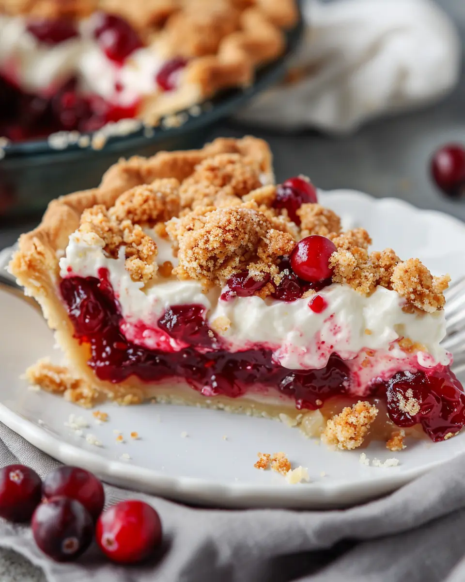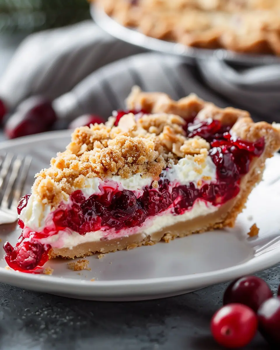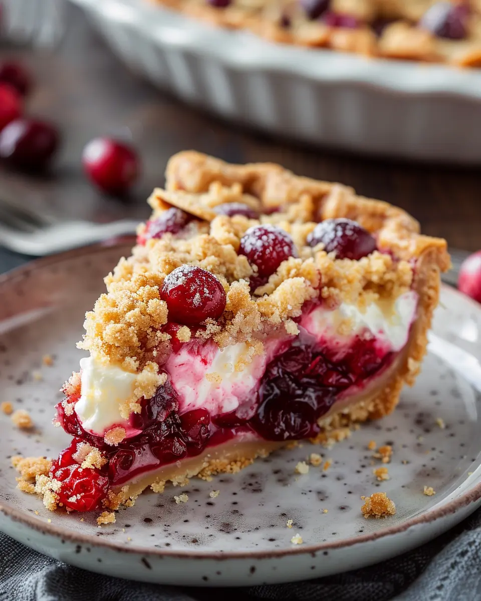 A delicious and festive pie combining tart cranberries with rich cream cheese and a crumbly topping, perfect for holiday gatherings.