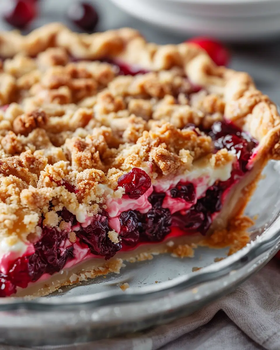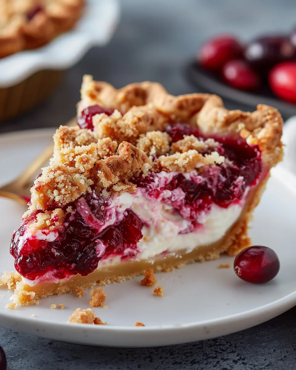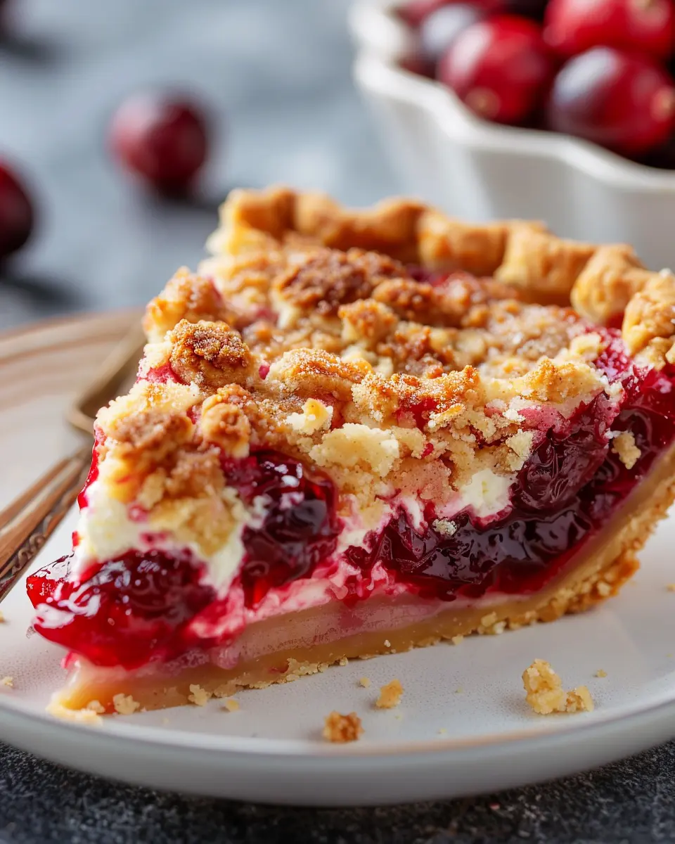 This pie combines the tartness of cranberries with the creaminess of cream cheese, all topped with a delicious crumb layer.