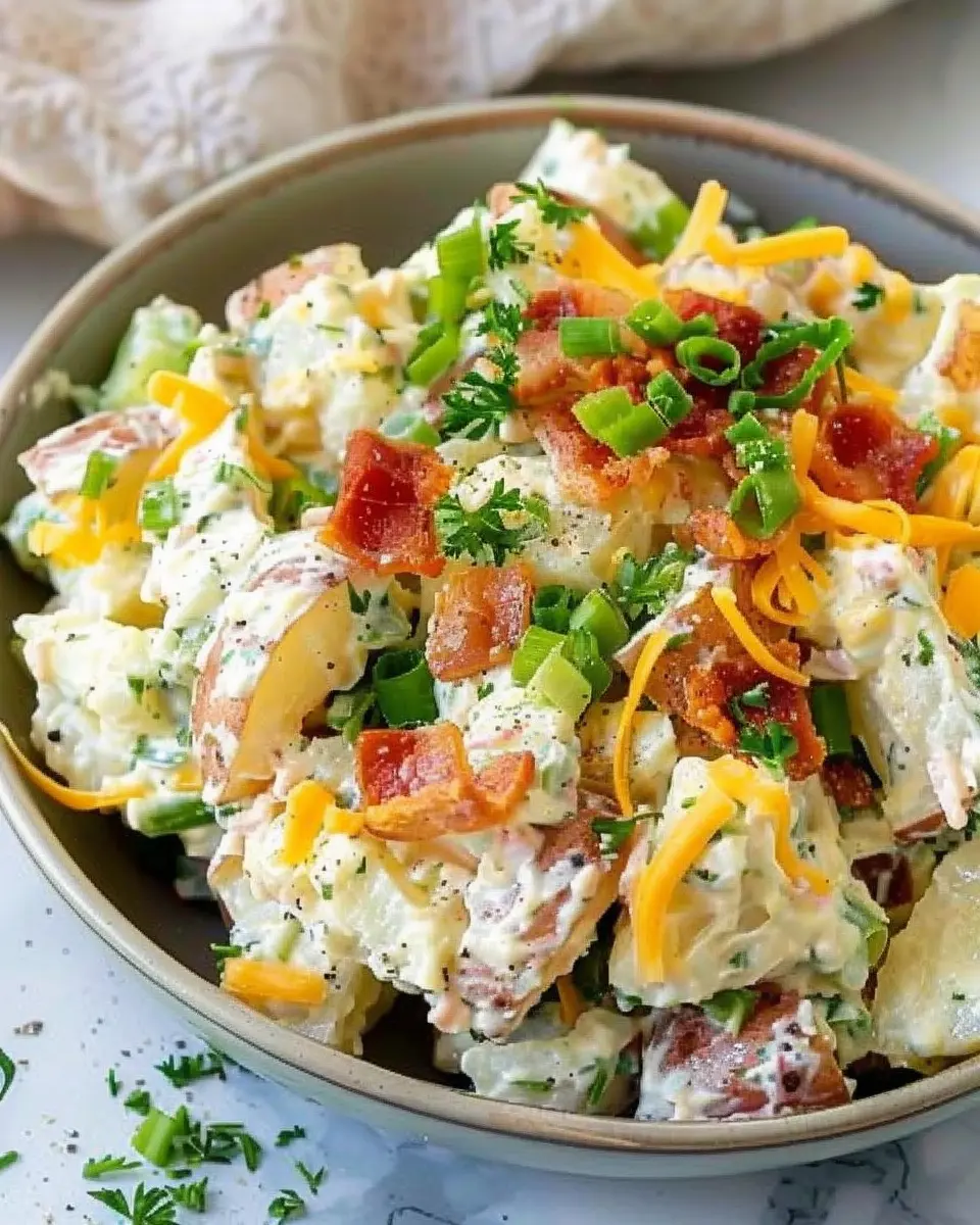 A deliciously indulgent twist on traditional potato salad, featuring turkey bacon and rich toppings.