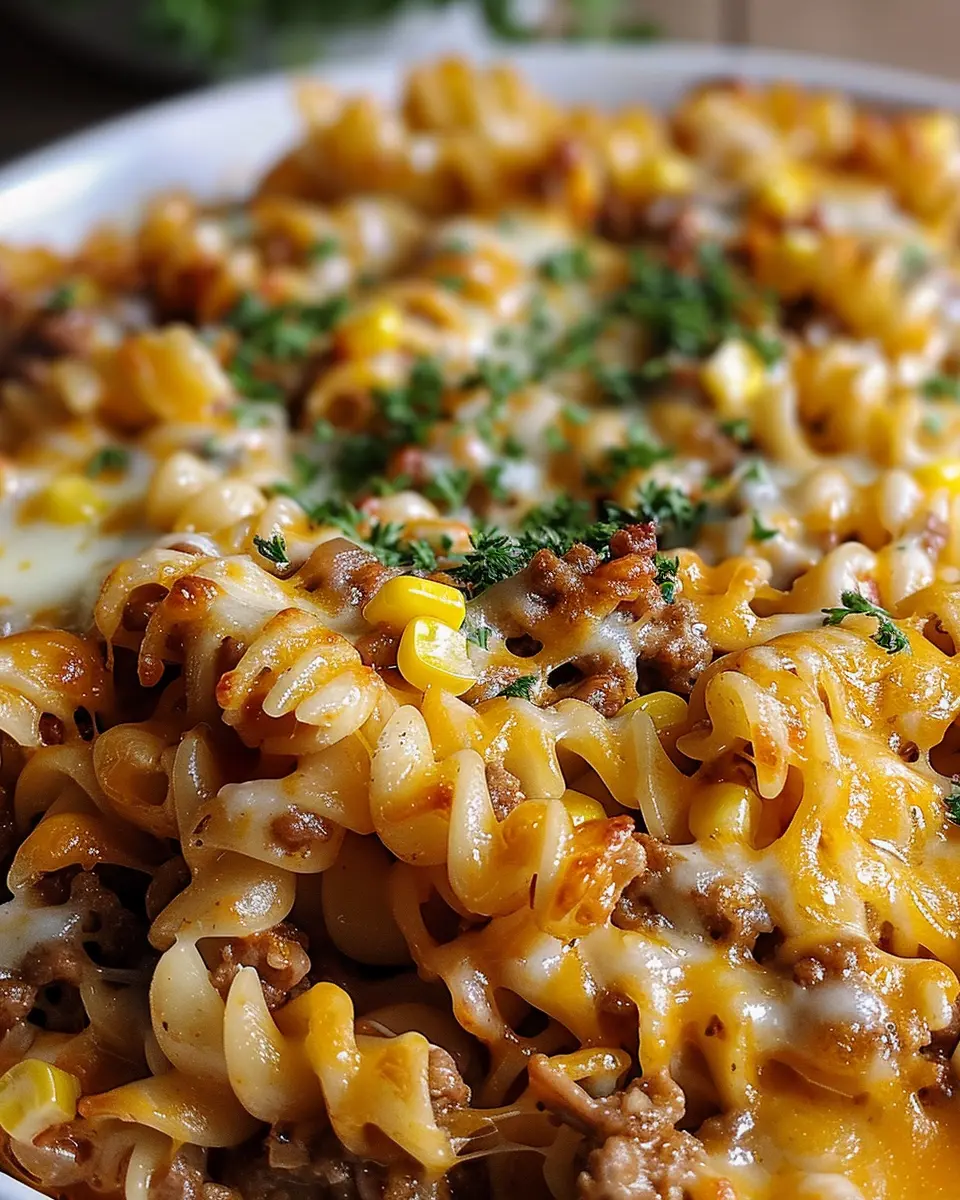PrintLoaded Cheddar Ranch Beef and Sweet Corn Rotini Bake: The Best Comfort Dish