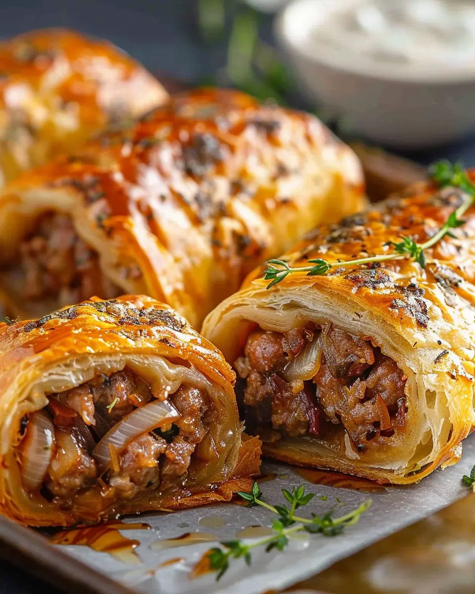 Indulge in these Savory French Onion Sausage Rolls that are perfectly golden, flaky, and filled with delicious flavors.